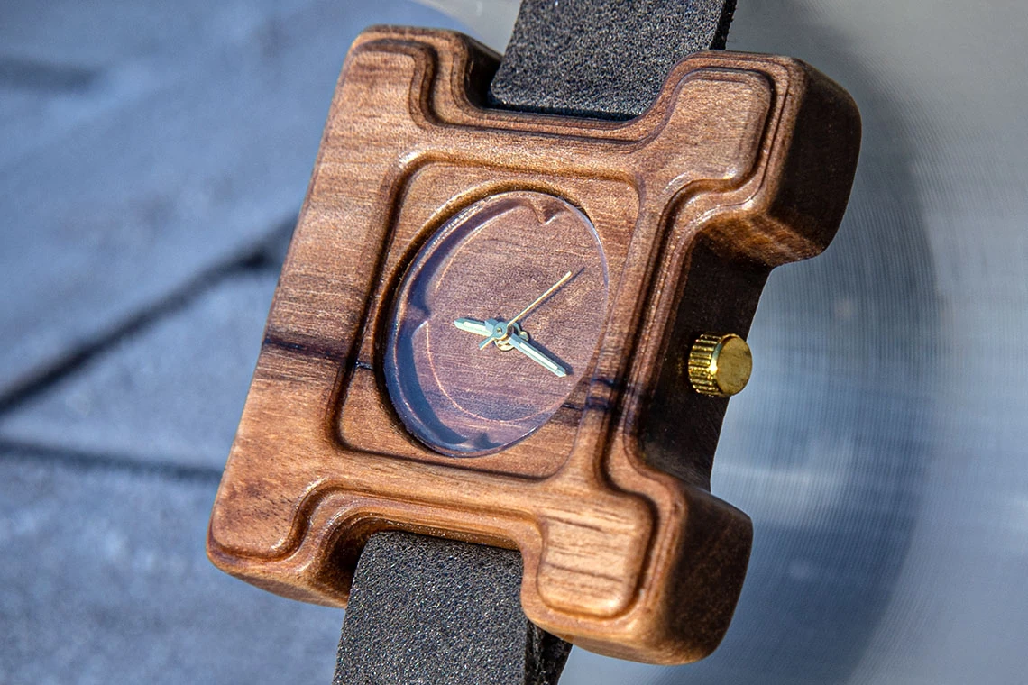 Dřevěné hodinky model „Hercule Poirot“, tvarově vycházejí ze čtvercové základny se zaoblenými rohy. Ve třech stěnách jsou vytvořeny zaoblené prohlubně. Dvě pro upevnění řemínku a jedno pro zapuštění poměrně velké korunky. Horní část není čistě plochá, ale je tvořena o něco užší kopií základního tvaru. V poměrně malém ciferníku jsou pro určení času vytvořeny čtyři zoubku pro každou čtvrthodinu. Ciferník je kryt vypouklým sklem o průměru 20 mm. To je o víc než milimetr zapuštěno oproti horní hraně těla. Dá se říci, že návrh hodinek je ovlivněn stylem Art Deco a zejména architekturou v tomto stylu. Hlavní inspirací byly rozevláté křivky na fasádě Londýnského dům Florin Court. V tomto domě bydlel v televizním seriálu slavný detektiv Agathy Christie. Podle něj se i hodinky jmenují.