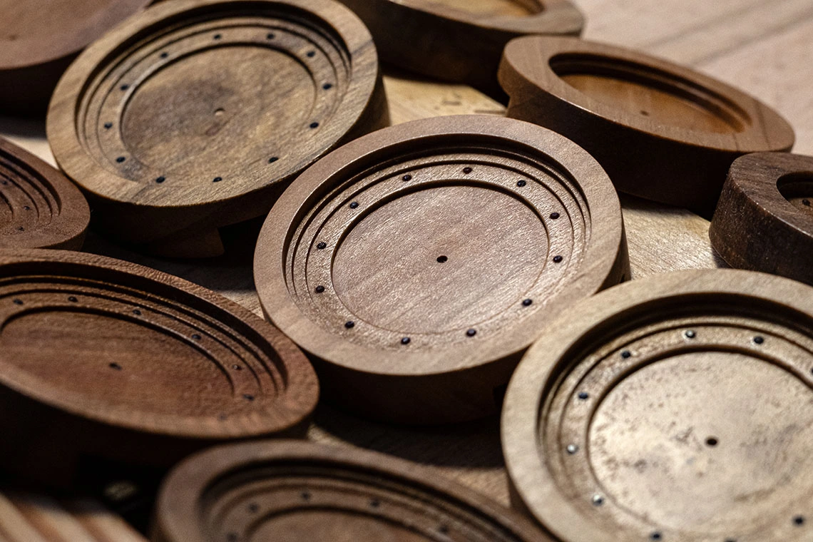 Naša cesta sa začína výberom najkvalitnejšieho dreva z českých lesov a sadov. Každý kus dreva osobne spracujeme od suroviny až po finálny výrobok. Používame najmä drevo z ovocných stromov, ako sú hruška, čerešňa, marhuľa, šveskta a višňa, ktoré vynikajú jedinečnou kresbou a teplými odtieňmi. Ponúkame aj hodinky vyrobené z orecha, habru, agátu, javora, gaštanu, a mnohých ďalších, pričom každý druh dreva dodáva hodinkám osobitý vzhľad a osobitosť.